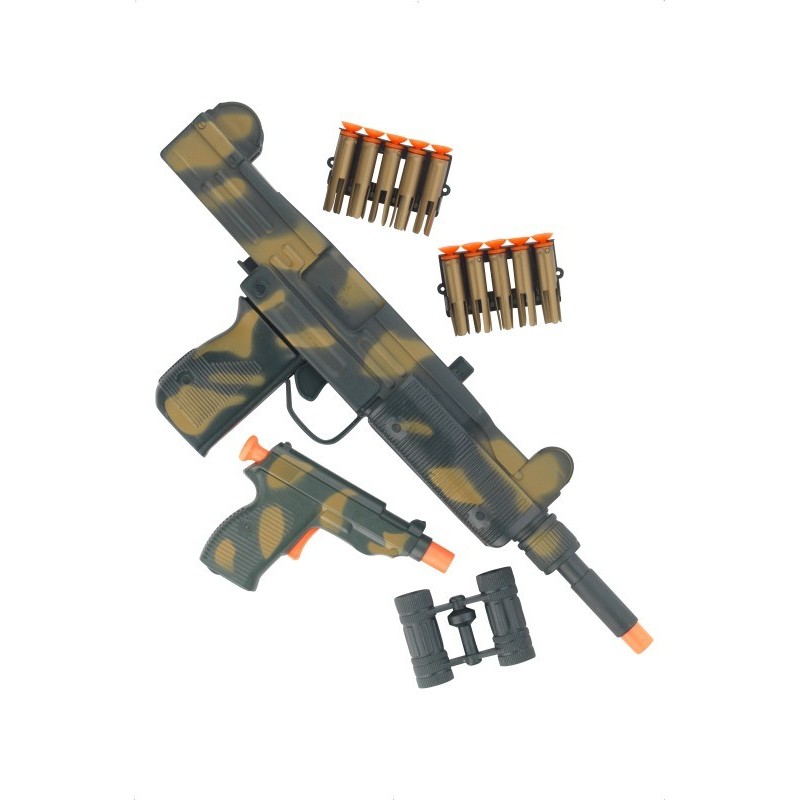 Incluye Metralleta de mano de 45cm, pistola, balas y binoculares